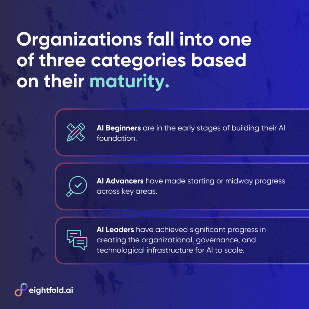 Our research of 700 organizations across North America, Europe, and Asia Pacific shows that AI transformation is well underway across industries. We assessed organizations across seven foundational pillars — from leadership alignment and governance to talent development and future-of-work planning — and grouped them into three categories based on their maturity: