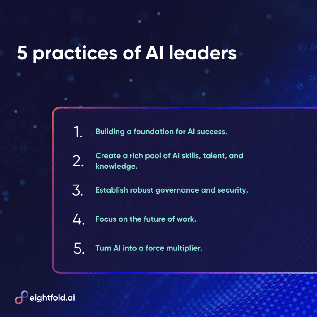 - Leading organizations follow five clear practices that build alignment, develop AI talent, establish governance, and prepare for AI-human collaboration, resulting in 3x more benefits than beginning organizations.