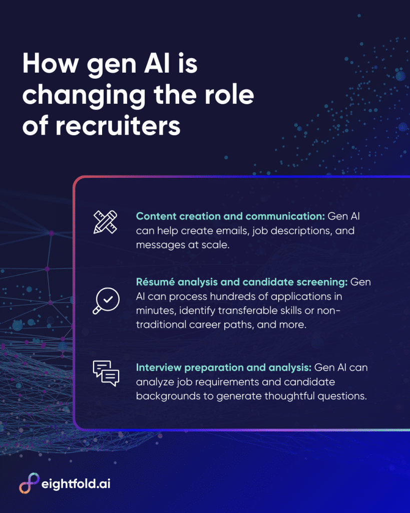 - Generative AI already creates personalized outreach at scale by analyzing hundreds of résumés, and generating job descriptions.