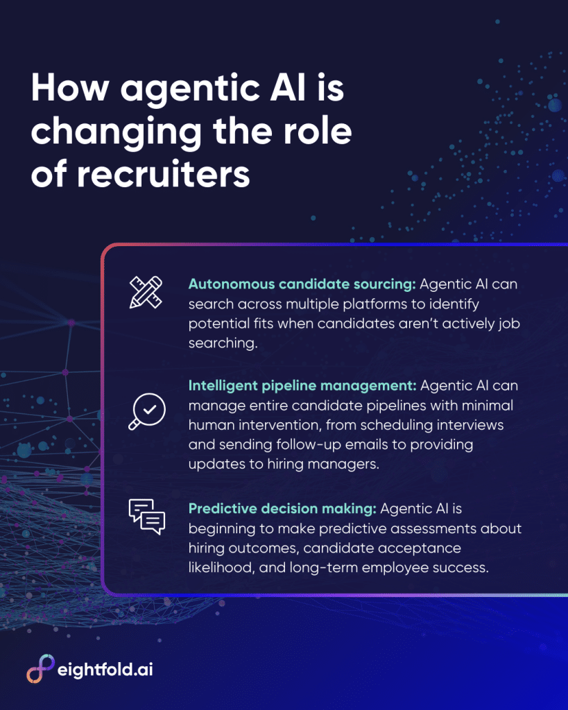 Perhaps most significantly, agentic AI can manage entire candidate pipelines with minimal human intervention.