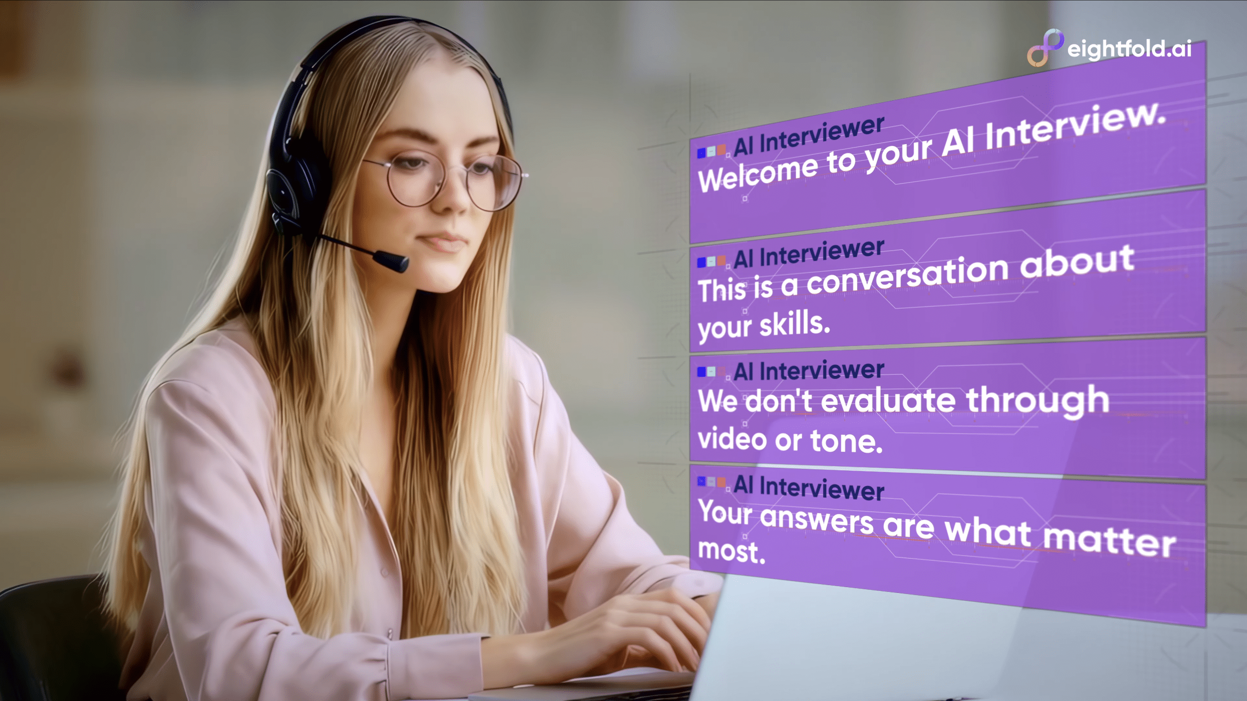 It evaluates only what candidates say — their skills, experiences, and capabilities — never how they look, sound, or emote.